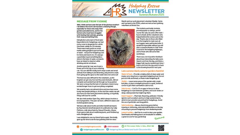 Our volunteer-run hedgehog hospital, co-ordinated by Yvonne Cox, cares, treats and rehabilitates over 300 hedgehogs every year; many of which are successfully re-released with the help of our wonderful network of volunteers. All money raised from talks, adoptions, donations and sales go to help pay for food, cages and medication.